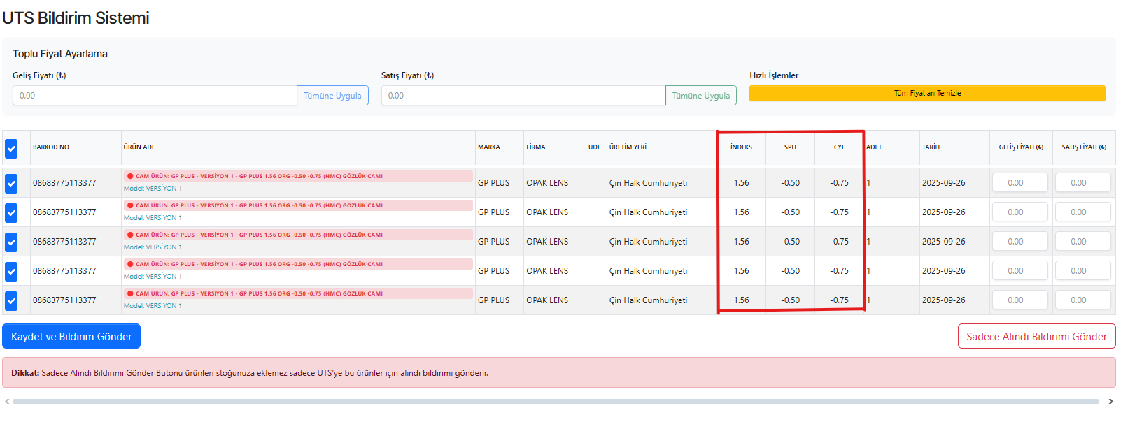 Bu veriler sayesinde artık cam kalınlığına, SPH ve CYL değerlerine göre raporlar alabilir, stoklarınızı çok daha net ve düzenli görebilirsiniz.